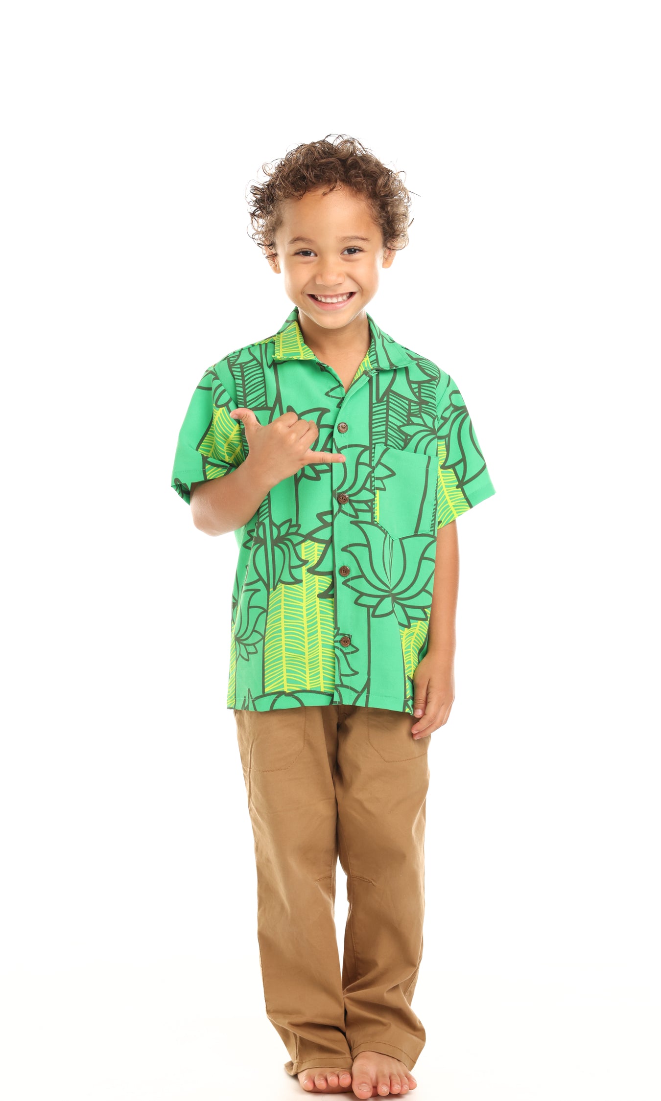 Kids short sleeve button down aloha shirt with matching chest pocket.