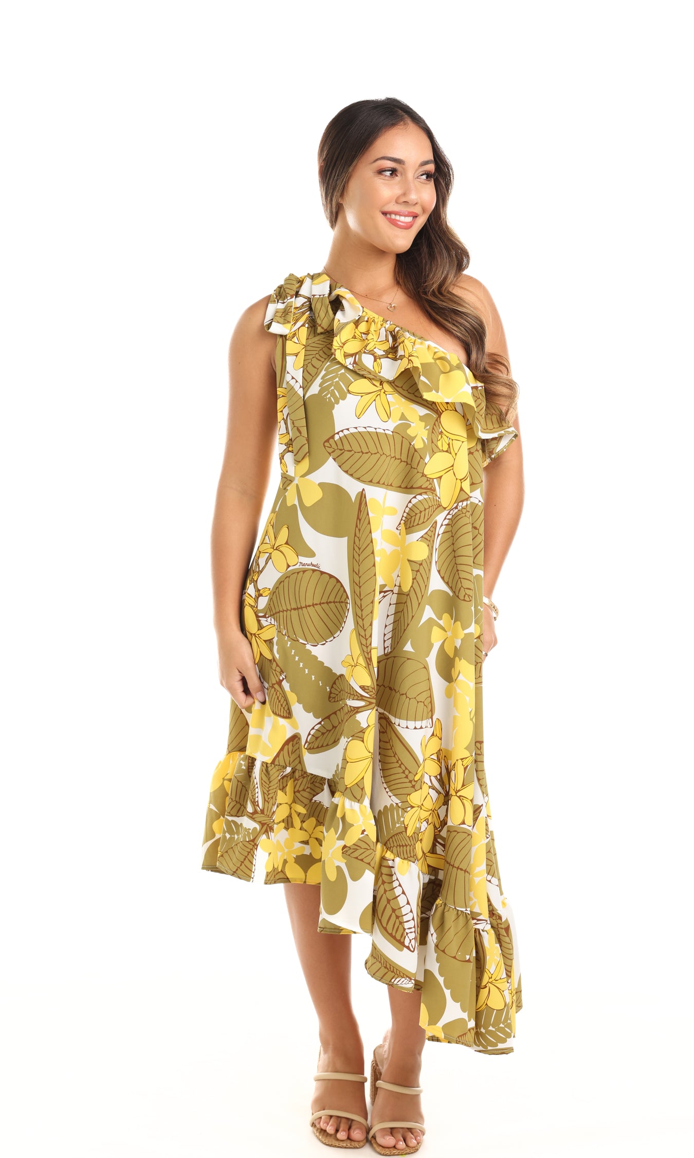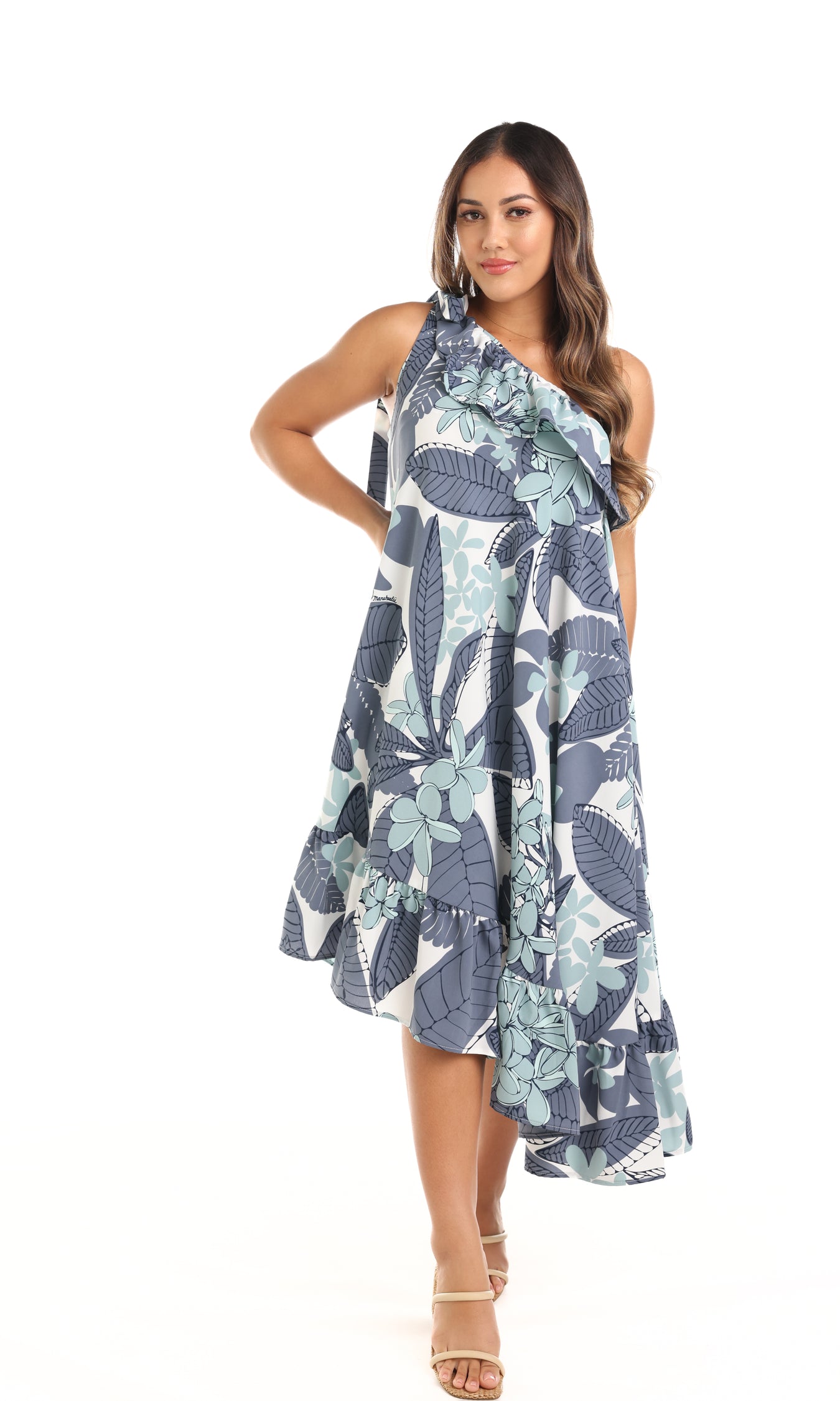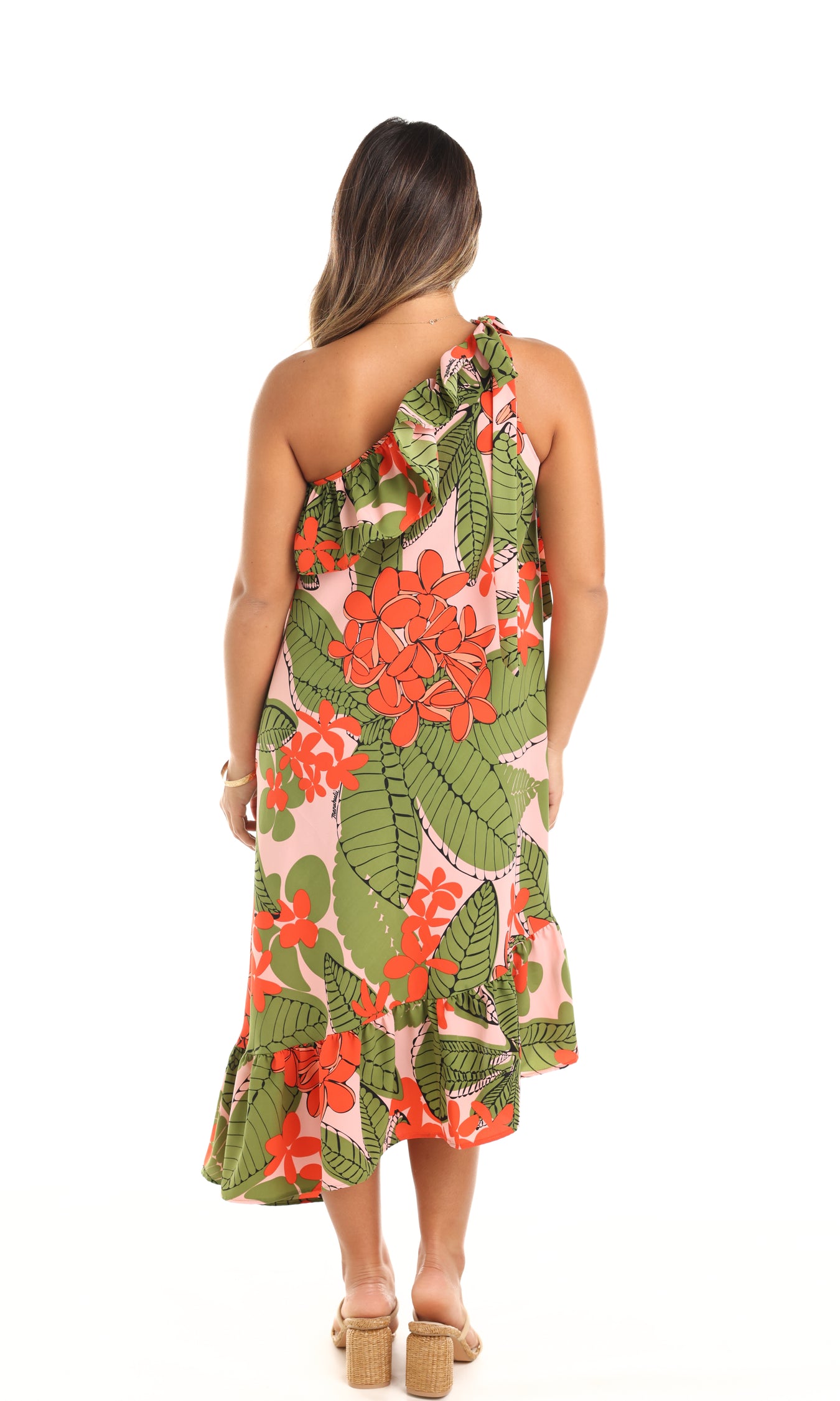 The Holokai is a one-shoulder, signature Nake‘u Awai style. It features an adjustable shoulder tie and lovely ruffle details.