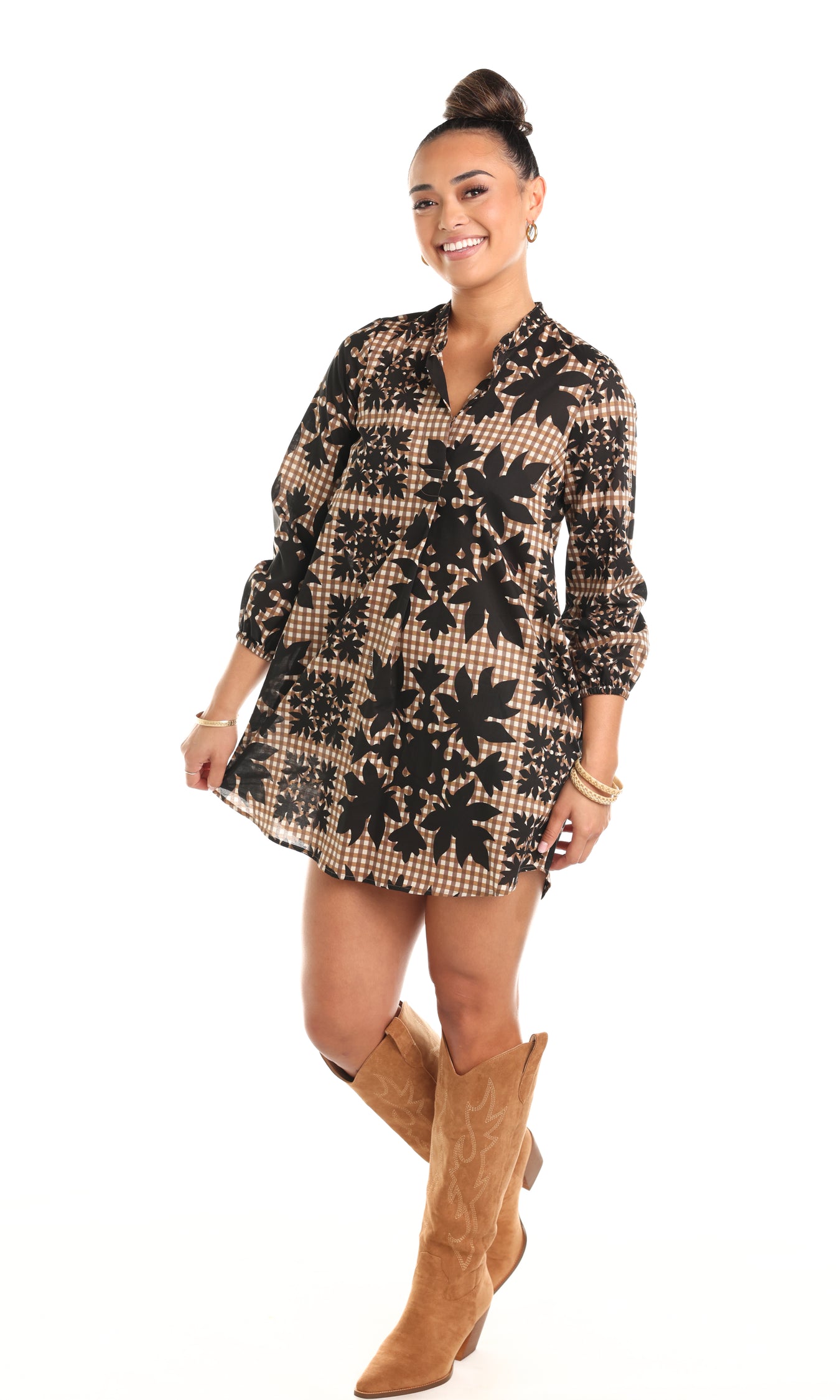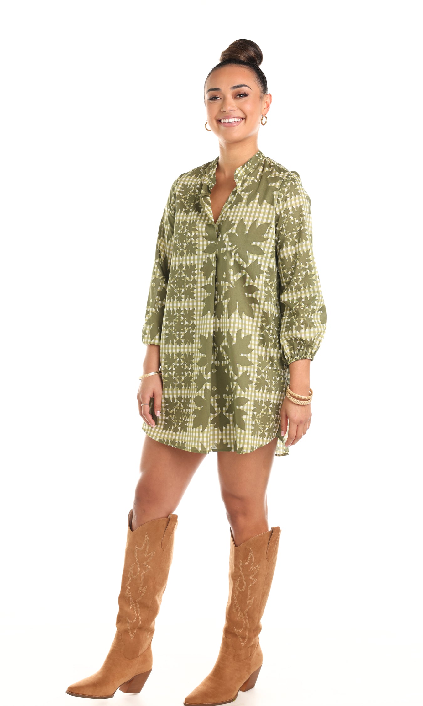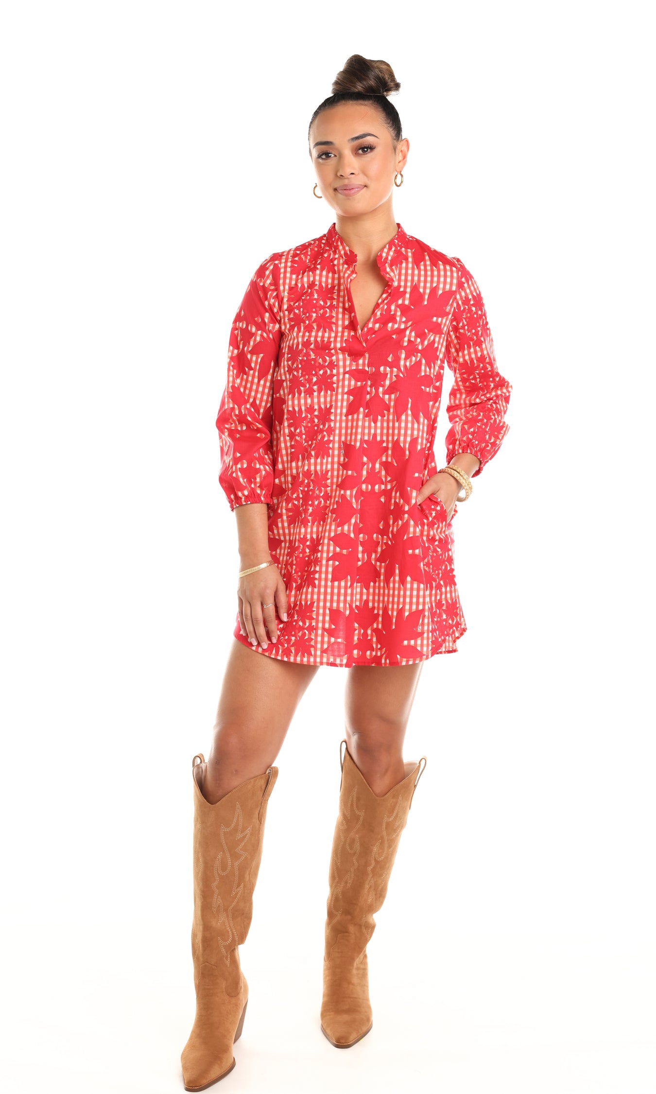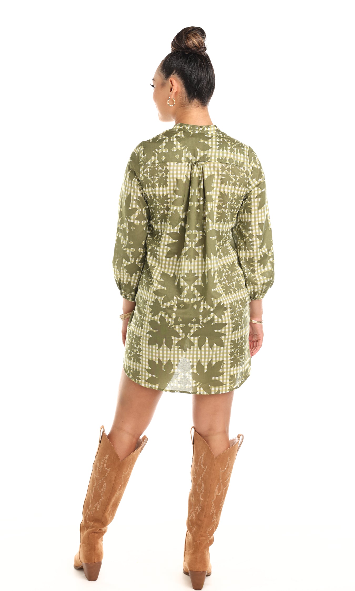 Classic mandarin collar pullover dress with a placket front. Elastic at the wrist of long sleeves and side seam pockets with a back yoke and gathered detail.