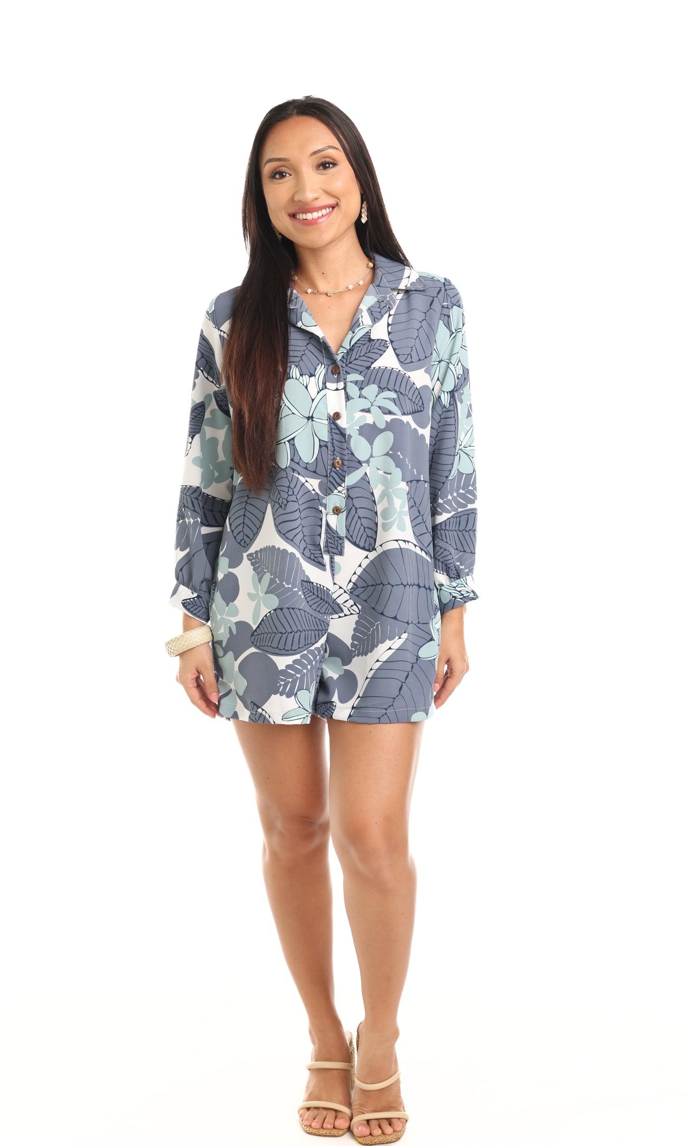 Placket front romper with sideseam pockets, collar, and button/cuff 3/4 length sleeves.
