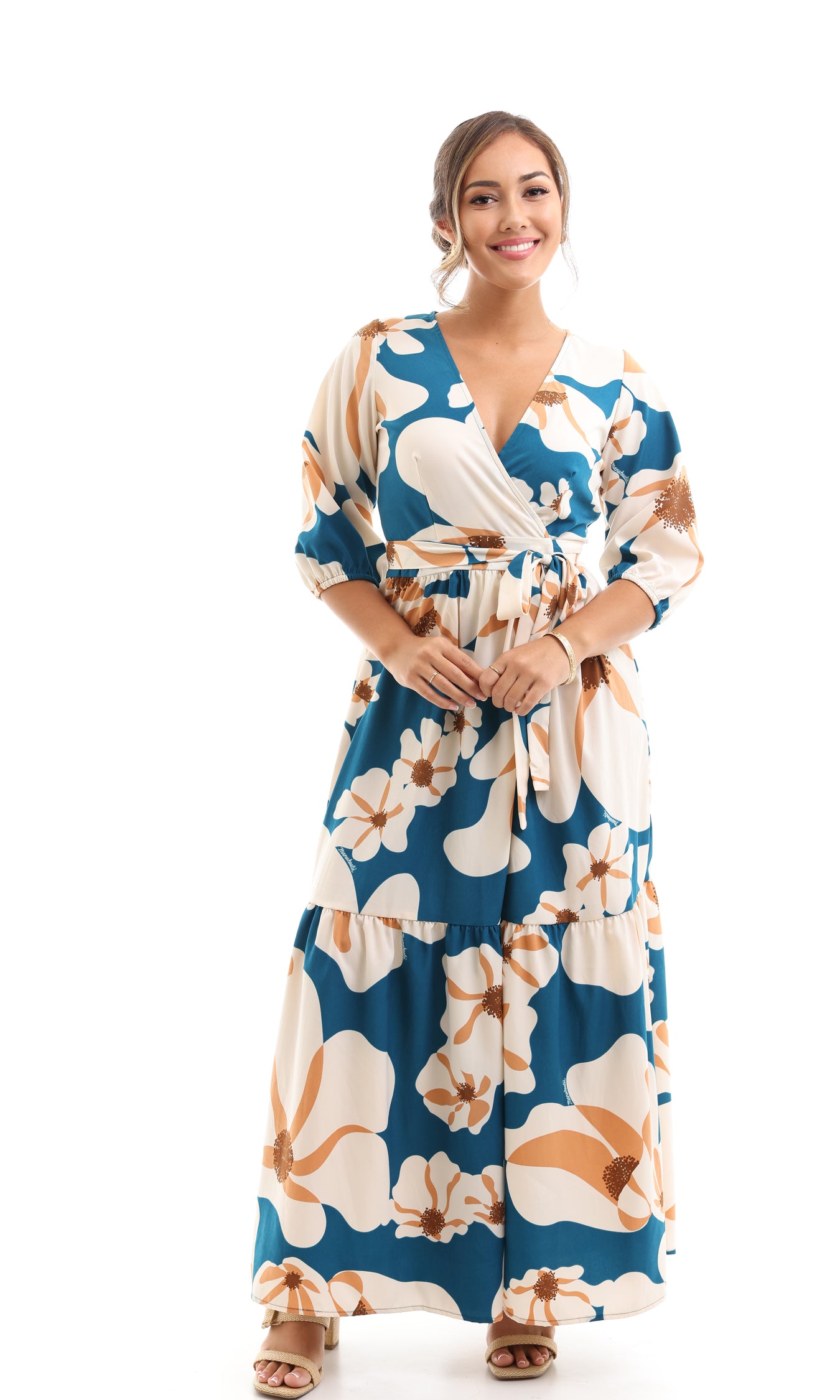 Full length wrap-maxi dress with 3/4 elastic sleeves & ruffle.